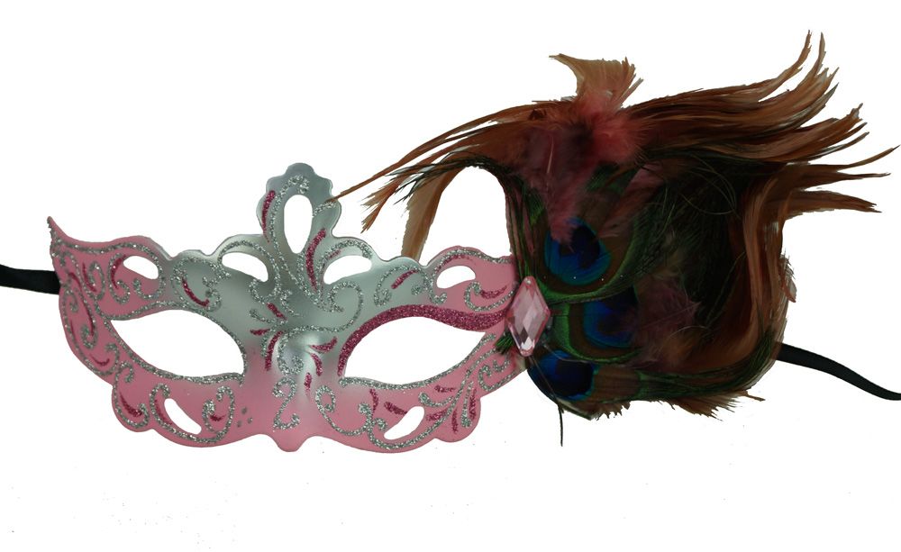 Aubrey Masquerade mask is a petite mask. This mask comes in for different colors to choose from. Mask comes with black ribbon ties. Mask color is silver and pink. Size 5-1/2" x 3