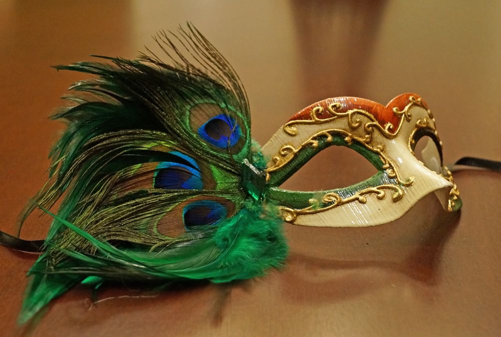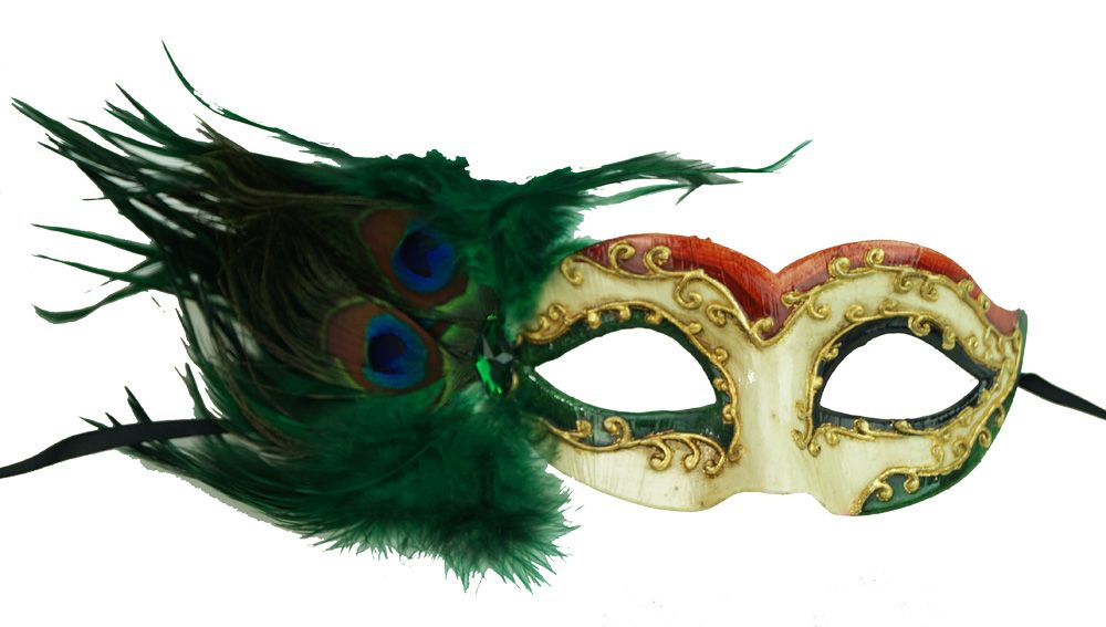 This masquerade mask has a unique hand brushed design with large green feathers on right side of mask. Mask is made of a durable molded resin. Secures with black ribbon ties. Size of mask without feather 6"W x 3"H.
