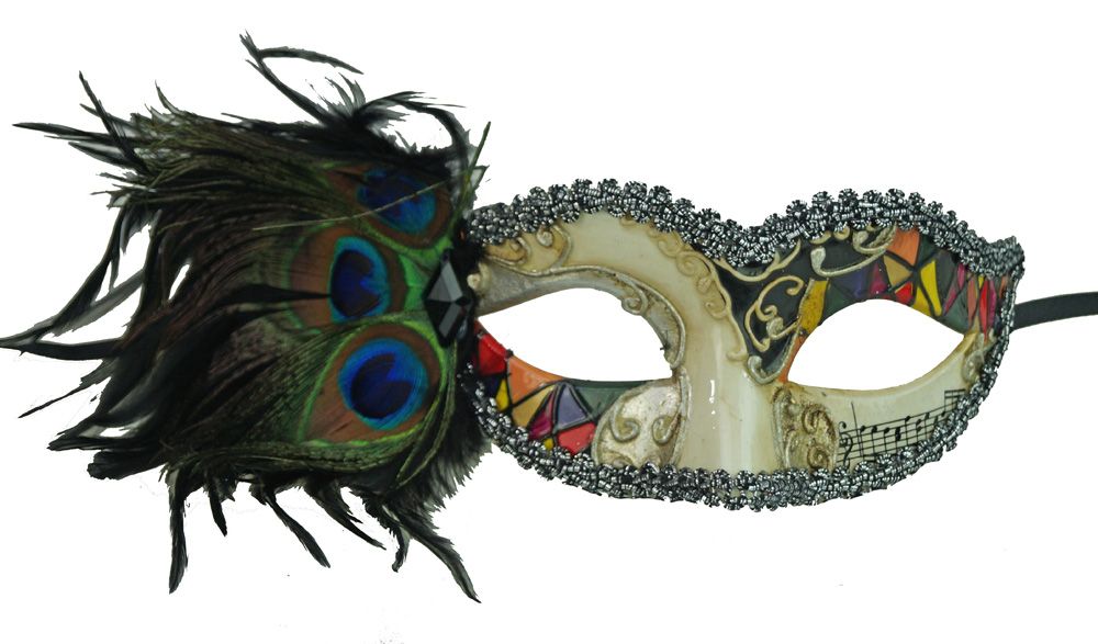 This Venetian mask is painted multi color mosaic style and has accented with large feathers on right side of the mask. Mask is made of a durable molded resin and comes with black ribbon ties.
