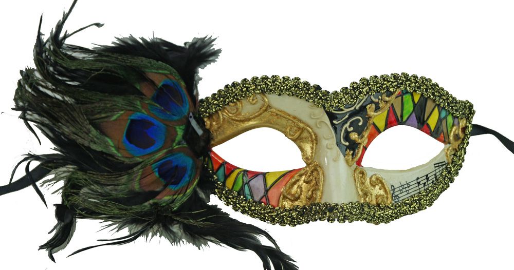 This Venetian mask is painted multi color mosaic style and has accented with large feathers on right side of the mask. Mask is made of a durable molded resin and comes with black ribbon ties.
